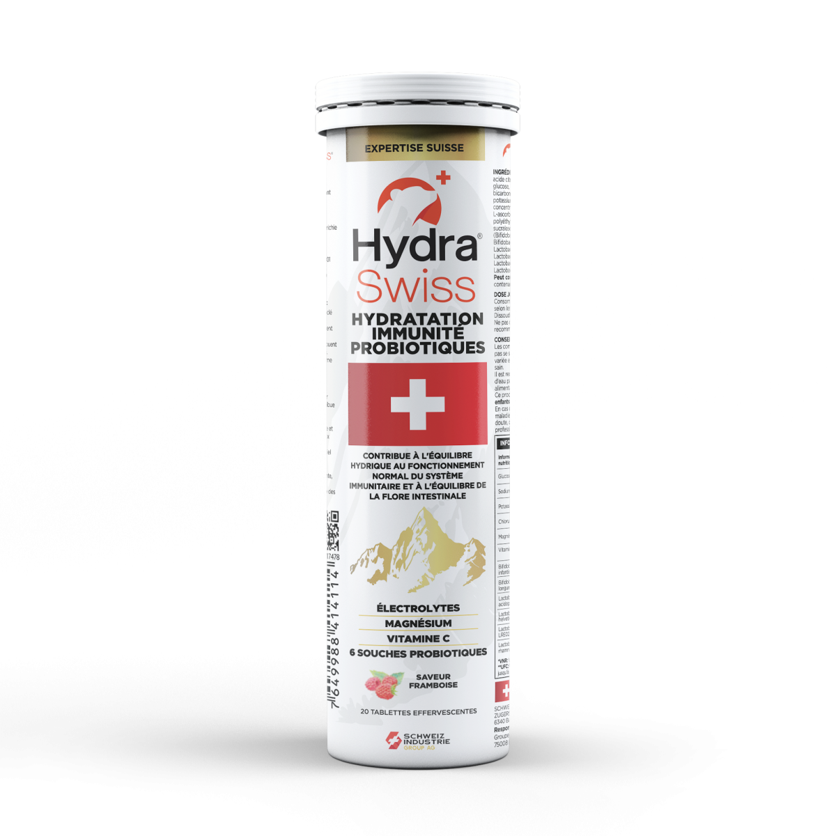 La première solution alliant hydratation, immunité et 6 souches de probiotiques micro-encapsulés dans des tablettes effervescentes goût framboise, HydraSwiss est un complément 3-en-1 unique pour répondre aux besoins du quotidien et redéfinir les standards de l'hydratation.